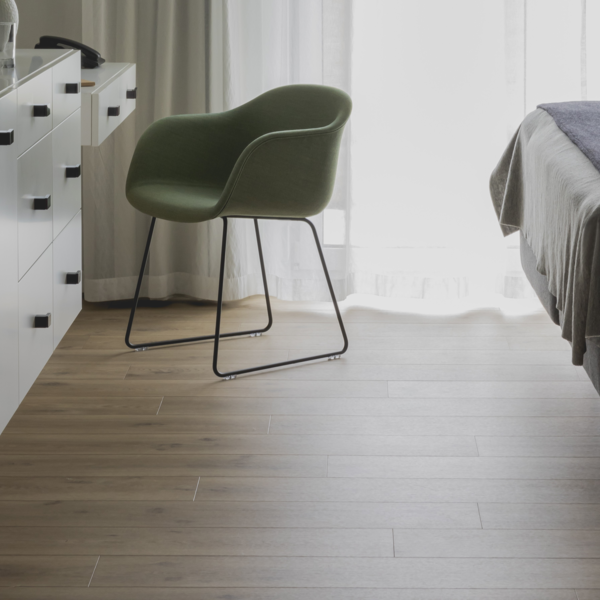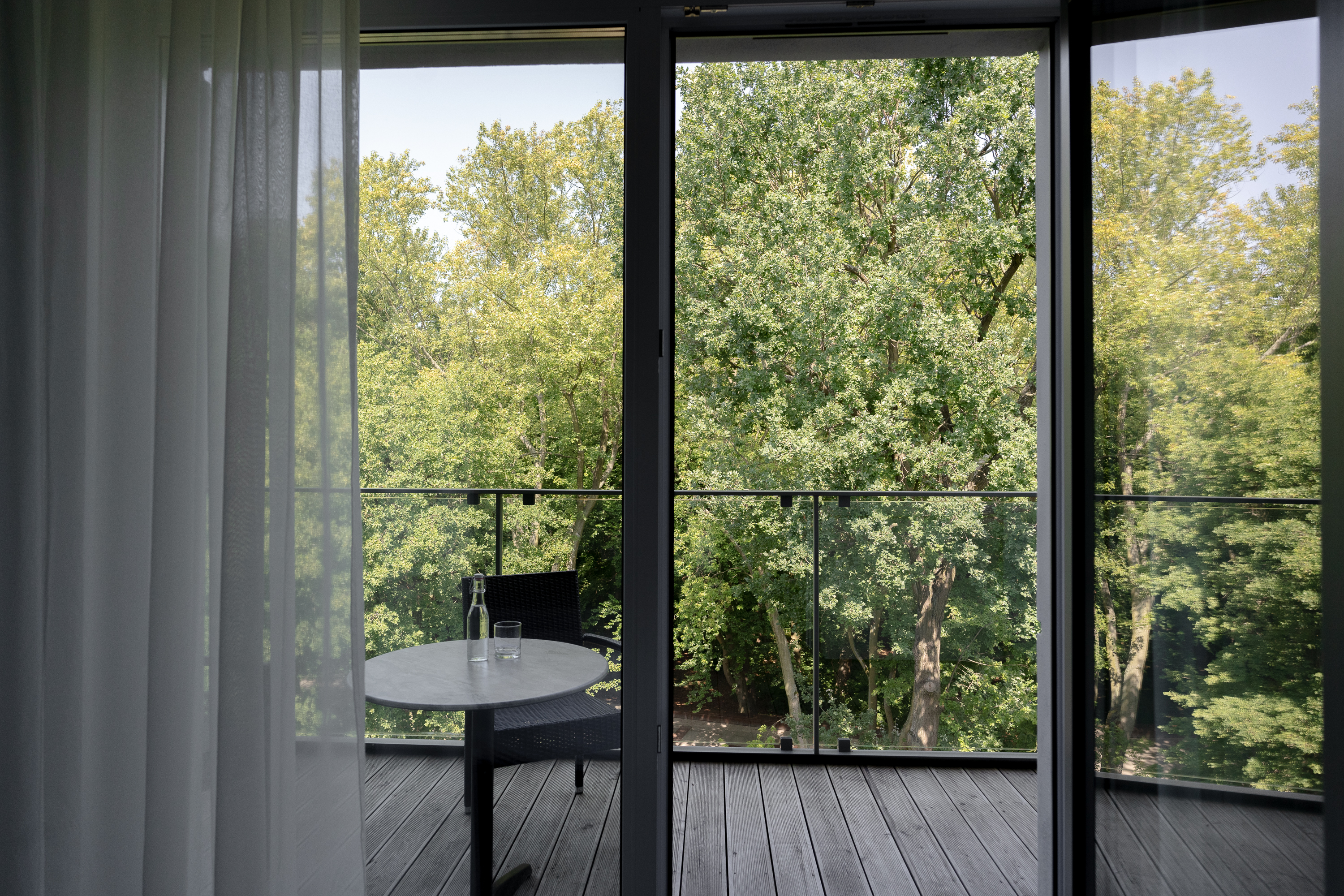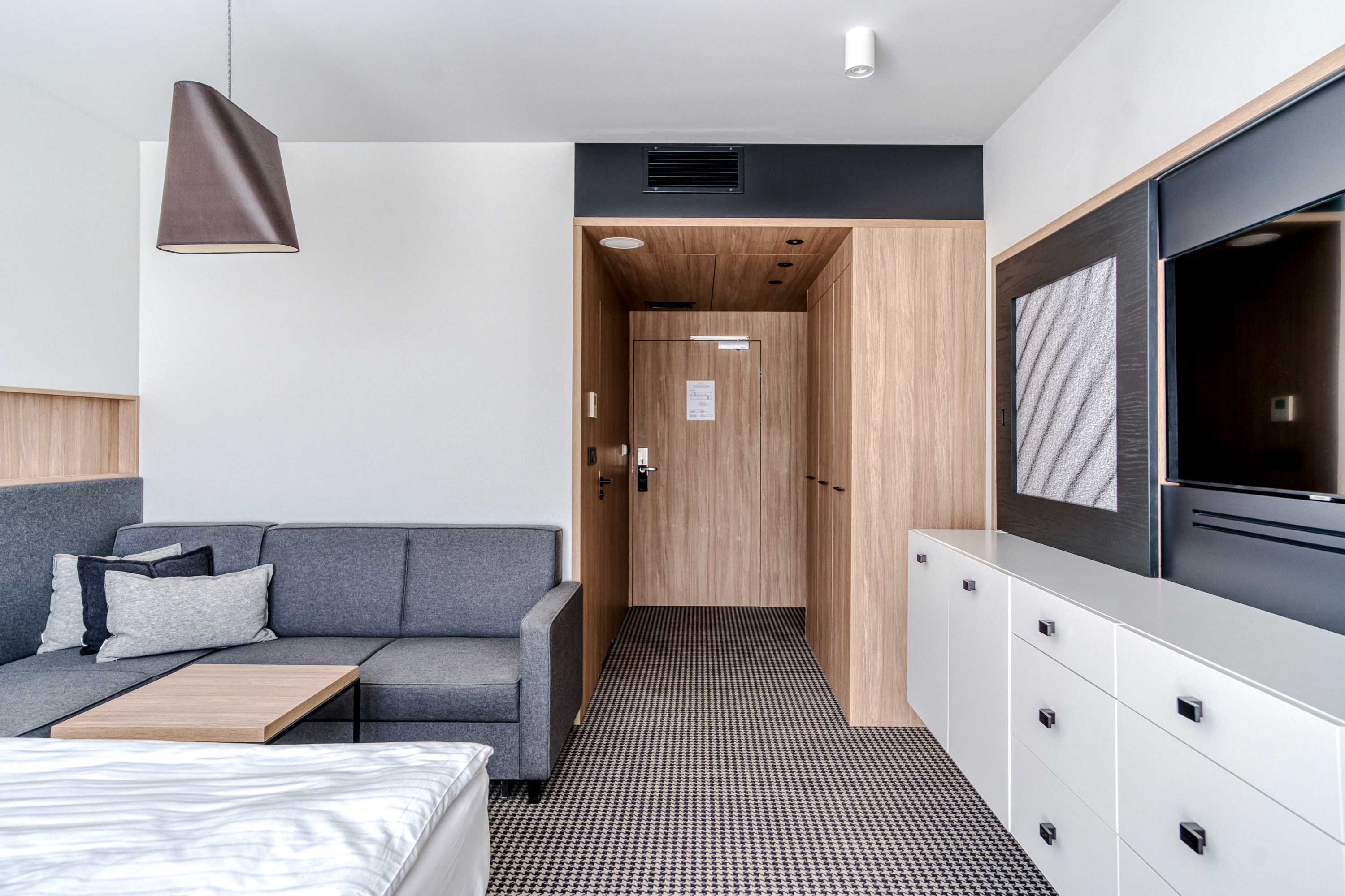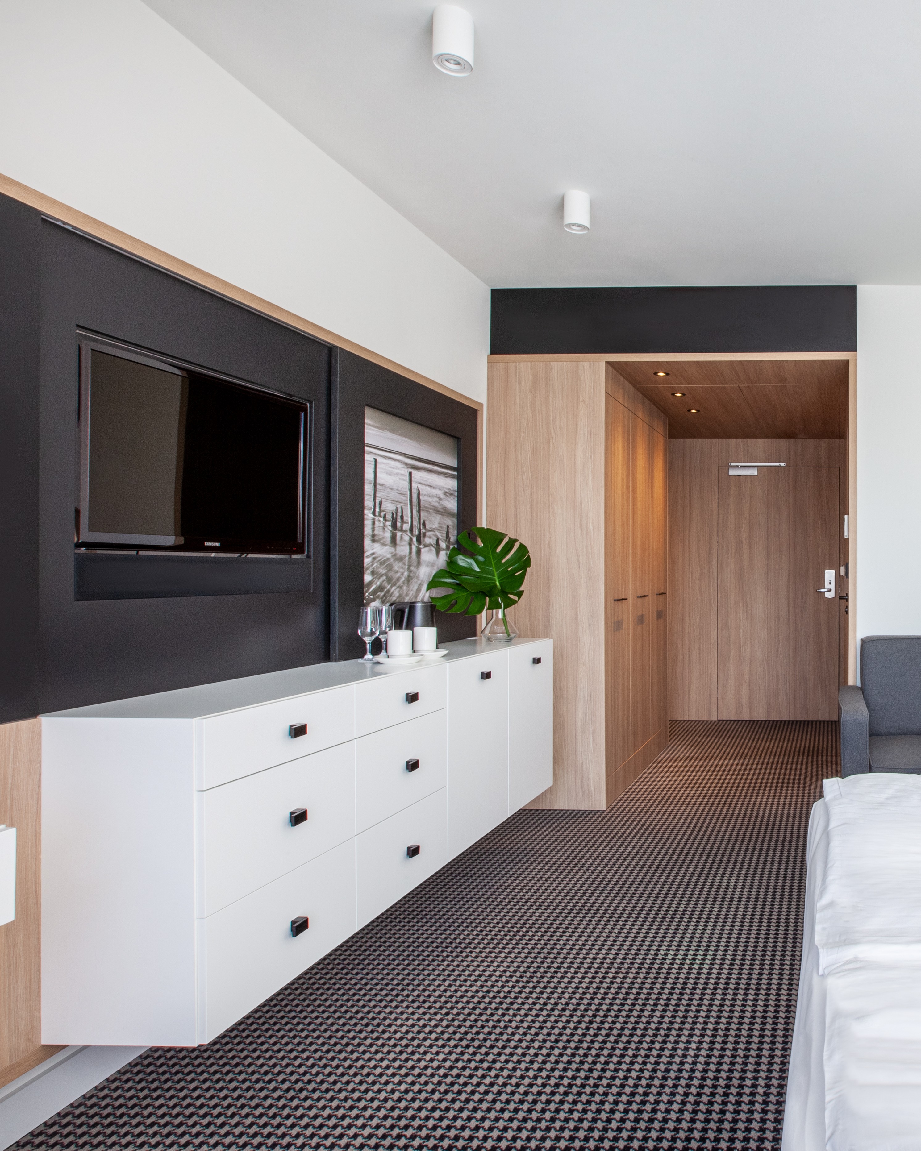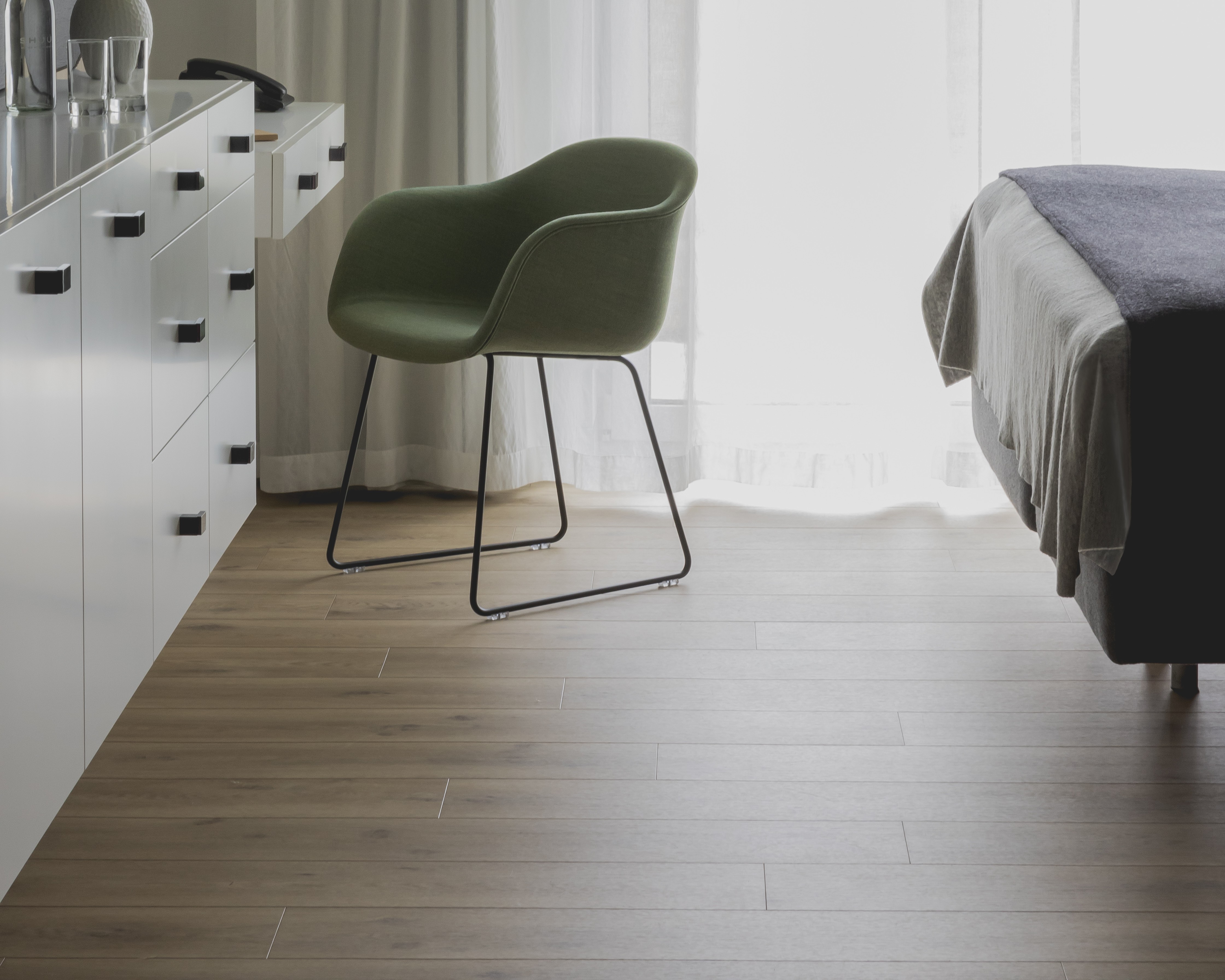 Der minimalistische Stil und die gedämpfte Farbpalette sowie die schallgedämpften Wände tragen zu einer ruhigen Atmosphäre bei.