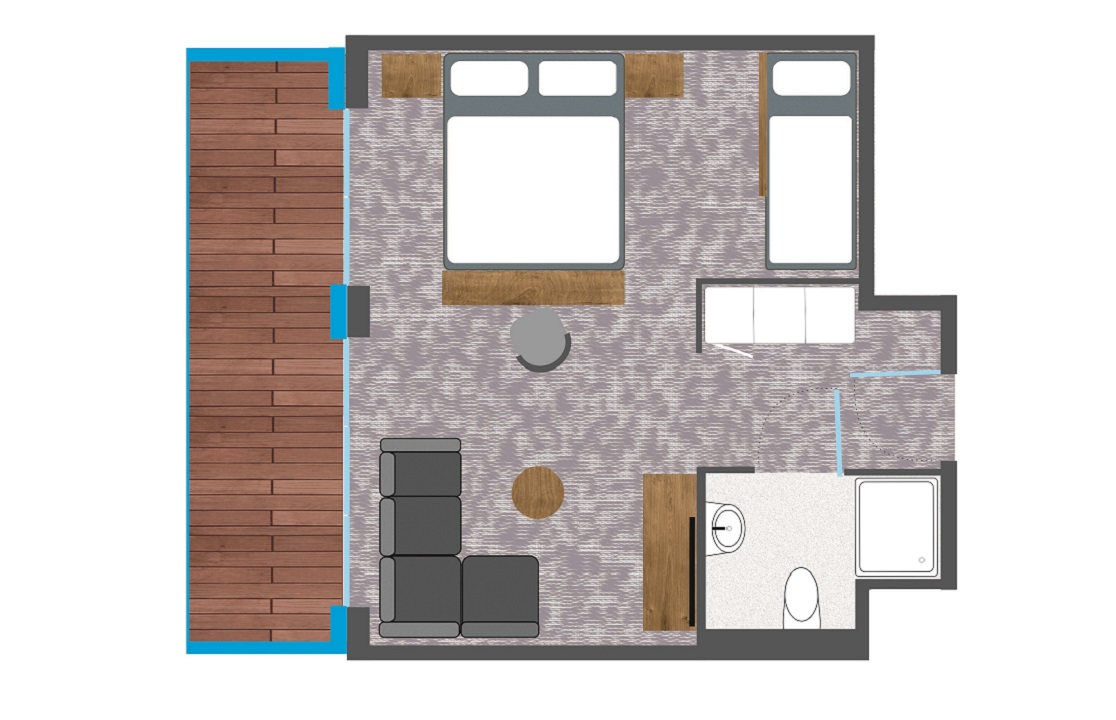 Die zurückhaltende Farbgestaltung, Filz, Holz und die Schalldämmung der Wände tragen zur Entspannung bei und ermöglichen es der ganzen Familie, sich vollständig auszuruhen.