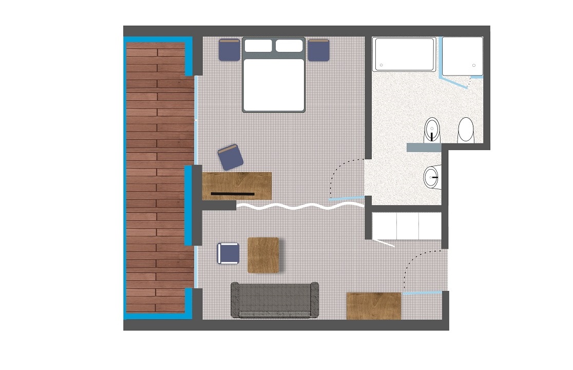 Die minimalistische Einrichtung, die zurückhaltende Farbgestaltung und die Schalldämmung tragen zu einer Atmosphäre der Entspannung und Ruhe bei. Das Zimmer bietet einen Blick auf den Küstenlandschaftspark.