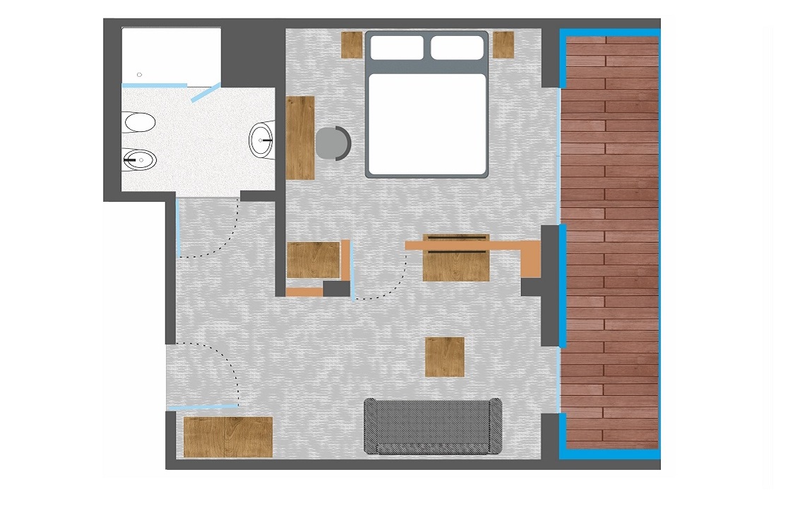 Das Schlafzimmer verfügt über ein komfortables Doppelbett (170x210), einen Schreibtisch mit Stuhl, einen Kleiderschrank und einen Fernseher. Im zweiten Raum – der durch eine Tür abgetrennt ist – steht den Gästen ein Sofa mit Schlafmöglichkeit, ein Couchtisch, ein Schreibtisch und ein zweiter Fernseher zur Verfügung.